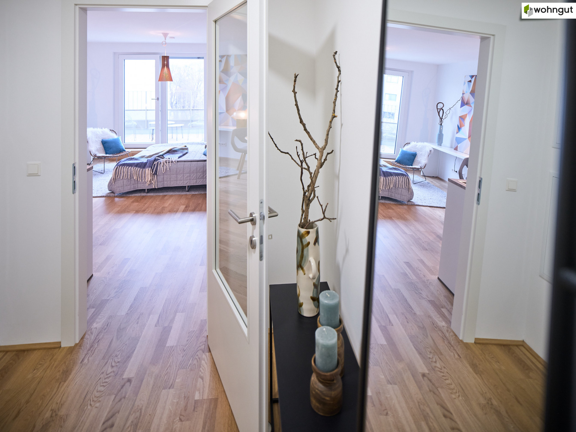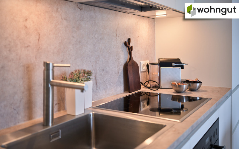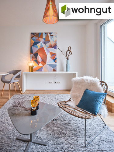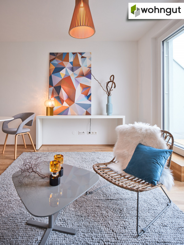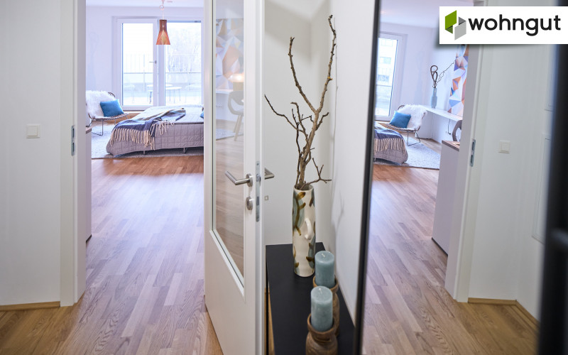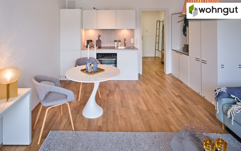 Die Ausstattung beinhaltet eine komplette Küche mit Geräten, einen Eichen-Echtholzparkettboden, eine Fußbodenheizung sowie schöne großformatige Fliesen im Badezimmer. Zusätzlich befindet sich ein praktischer Handtuchheizkörper im Bad.