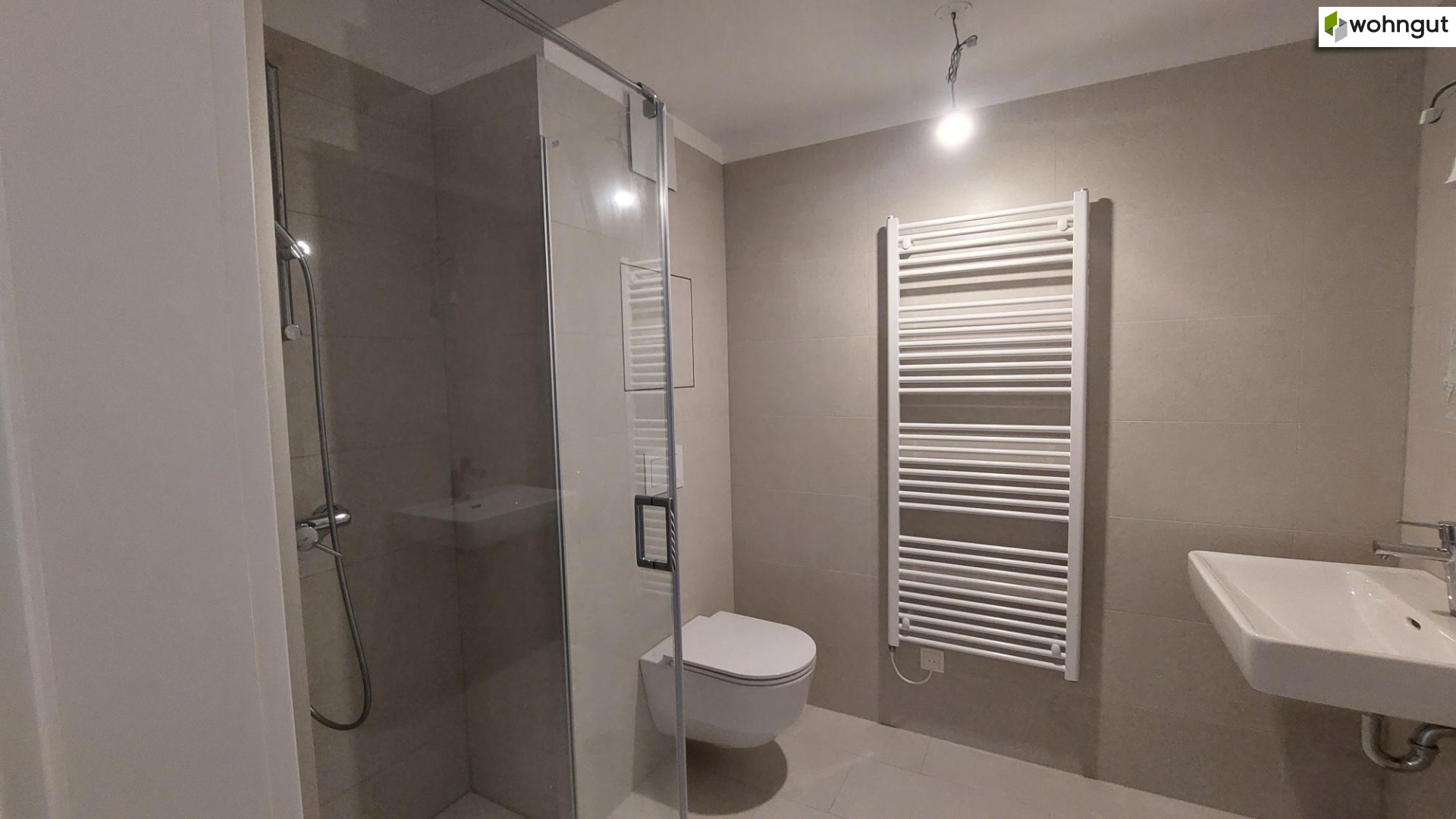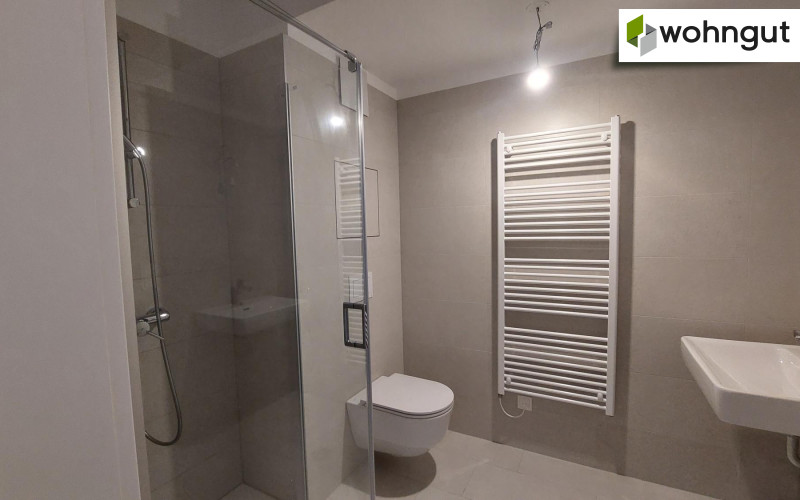 Die Ausstattung beinhaltet eine komplette Küche mit Geräten, einen Eichen-Echtholzparkettboden, eine Fußbodenheizung sowie schöne großformatige Fliesen im Badezimmer. Zusätzlich befindet sich ein praktischer Handtuchheizkörper im Bad.